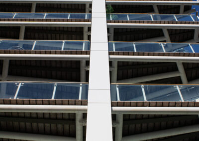 - Transition interfaces with retained curtain walling and new spandrel panels were carefully detailed using bespoke flashings and non-combustible fire barriers