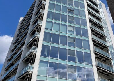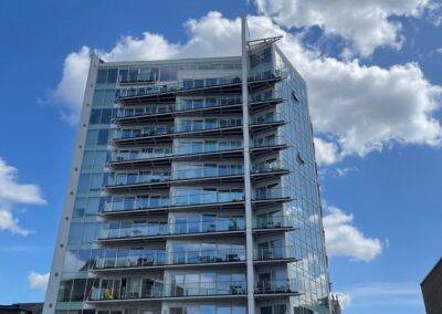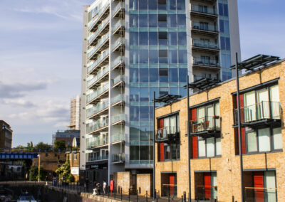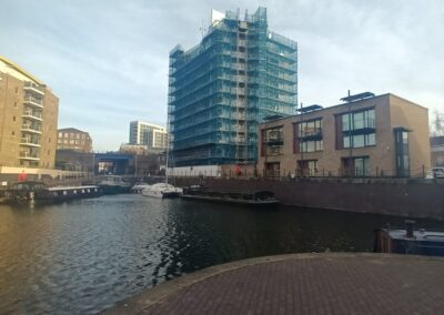 Standing at 39.6 metres high and comprising ground floor commercial units with 11 storeys of residential accommodation above, Block D at Basin Approach is a prominent building along London’s Limehouse Basin. The mixed-use structure houses 31 apartments and a variety of businesses, forming part of a wider regeneration zone with heavy footfall and architectural prominence.